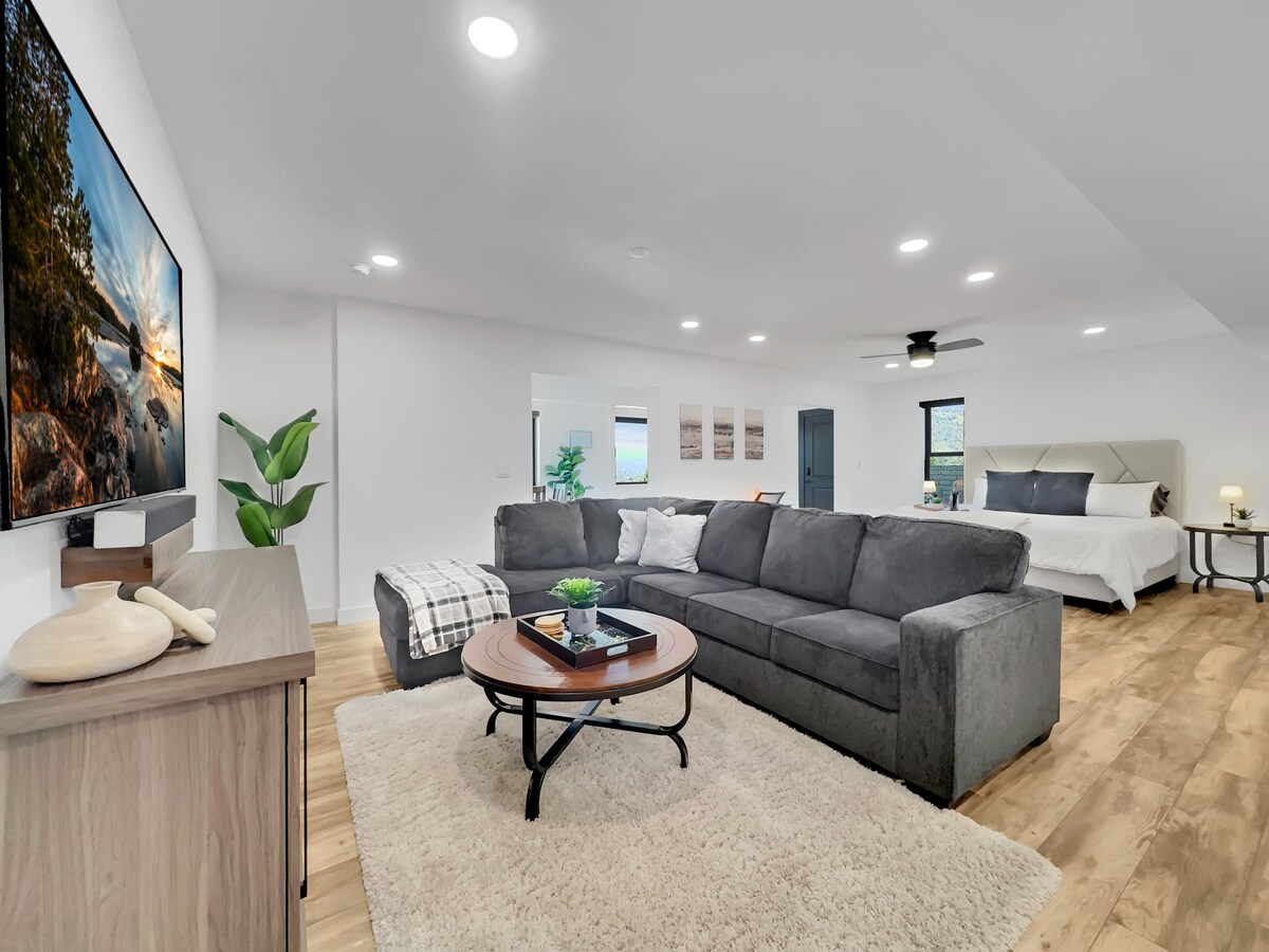 This is a separate & private suite, with free parking for 1 vehicle & a private entrance. Walking distance to Courthouse/Whiskey Row, about 1.25 miles & Prescott Resort 1 miles. 4.1 miles to Watson lake. Equipped with a full size refrigerator, induction cooktops, oven/air frier, dishwasher, microwave, dinnerware, drinkware & utensils. Also provided are kitchen, and bed & bath linens. Additional pillows, blankets, towels, pack-n-play, iron, picnic basket & more available on request