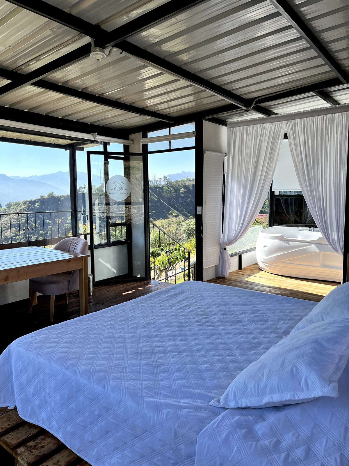 Acogedora cabaña diseñada para disfrutar la tranquilidad del campo con todas las comodidades. Cuenta con una única habitación ideal para alojar desde una persona hasta una familia de cuatro. Ubicada en una zona rural , ofrece aire puro y un ambiente sereno, además de un hermoso balcón con vista a las montañas. Su diseño combina lo mejor de la arquitectura moderna y clásica, y dispone de una relajante tina de hidromasaje perfecta para desconectarse y vivir una experiencia única.