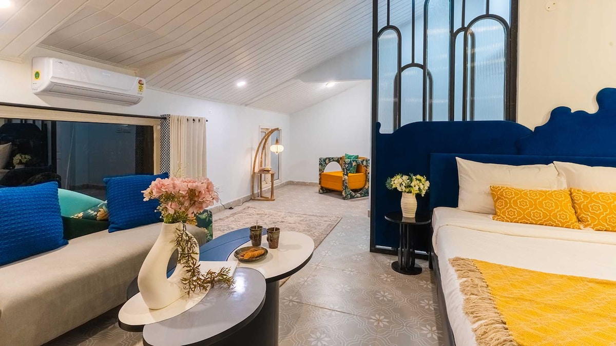 Sleepy Blue - 1 Bedroom Luxury Suite with beautiful mountain view Wake up to the calm of the hills in Sleepy Blue, a beautifully designed private luxury suite at Seclude Kasauli that perfectly blends space, comfort, and breathtaking views. True to its name, the room carries a soothing, serene vibe with soft tones and thoughtfully curated décor that instantly makes you feel relaxed. Step out onto your private balcony and take in the fresh mountain air.