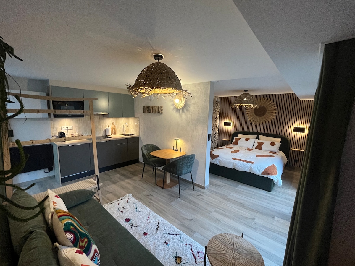 Fil-qalba tal-belt li qed tinħaraq, qrib il-Gare des Guillemins, noffru dan il-loft lussuż ta' 100 m2 fi stil li jgħaqqad l-eleganza mal-faxxinu. F' ambjent klassiku u rilassanti, lejl romantiku jew tmiem il-ġimgħa b' banju tal-balneoterapija, spazju eżotiku fuq barra, kamra tal-banju spazjuża b' żewġ irjus tax-xita, sodda fuq wiċċ l-ilma b' disinn Taljan għal mument rilassanti għal tnejn. Possibbiltà ta' dekorazzjoni romantika jew personalizzata fuq talba.