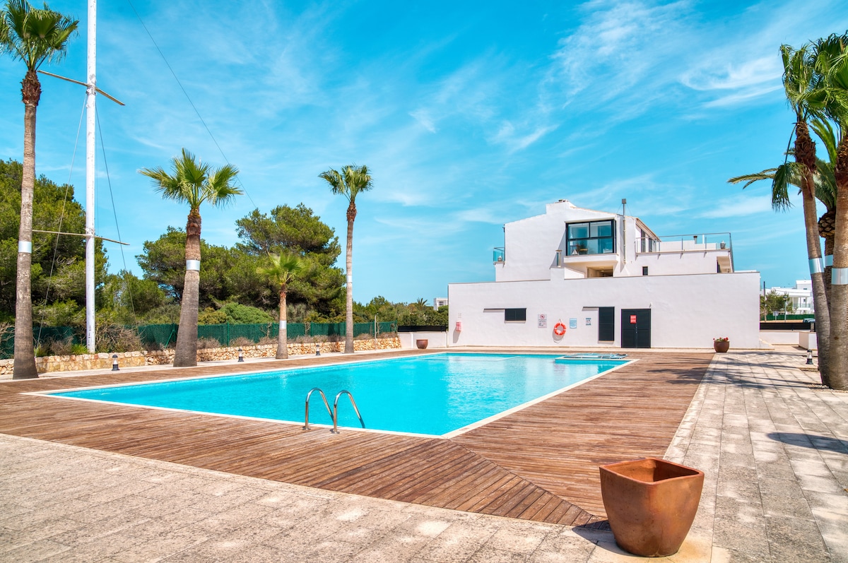 Din id-dar tieħu serħan il-moħħ: Irrilassa mal-familja kollha! Appartament fil-qalba tan-natura li għadu kif ġie rranġat b' kamra tas-sodda u sodda ta' 150 persuna, salott b' sufan sodda għal 2 persuni komdu ħafna, kċina, kamra tal-banju, terrazzin ta' quddiem b' veduti tal-baħar u tal-pixxina, terrazzin privat fuq wara. Spectaular Lugar playa de Arenal d'en Castell f' mixja ta' 5 minuti. Żona kwieta u pjaċevoli imma bis-servizzi kollha; ristoranti, spiżerija, supermarket, pubs, klabb tal-bajja u linja tal-karozzi tal-linja.