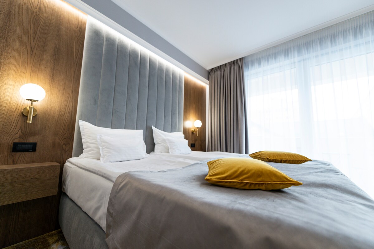 Il-kumdità u l-eleganza fil-qalba tan-natura, fl-appartament Luxury tagħna fil-kumpless esklussiv tal-Ġenn Transilvanjan. Ideali għal koppji, familji żgħar jew gruppi sa 4 persuni, dan l-appartament joffri taħlita perfetta ta' raffinar u rilassament. Kamra tas-sodda spazjuża b' sodda ta' daqs king premium, lożor tal-ogħla kwalità u dekor klassiku, maħluqa għal irqad ta' lejl mistrieħ. Terrazzin fuq barra li jagħti fuq il-pixxina. Kamra tal-banju eleganti b' finituri lussużi, kabina tad-doċċa u banju.