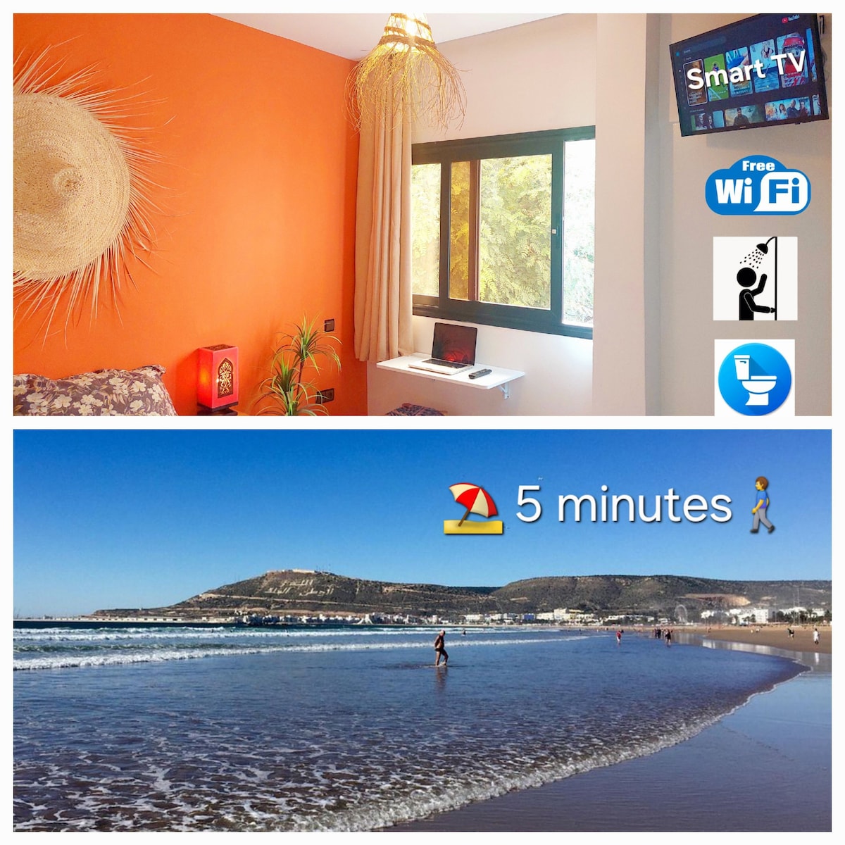Superhosts, will be delighted to welcome you to our recent beautiful, lovingly decorated apartment, close to the beach on foot. Beach "Vallée des Oiseaux" + "Beldi Fusion Kitchen Restaurant Agadir" is a 5-minute walk away. Our apartment is located next to the famous "Place Al Amal" Square + garden "Vallée des Oiseaux" + "Loubnan Mosque". Everything is within easy walking distance, so you won't need to spend money on transportation (see Goog,le Map,s Agadir).