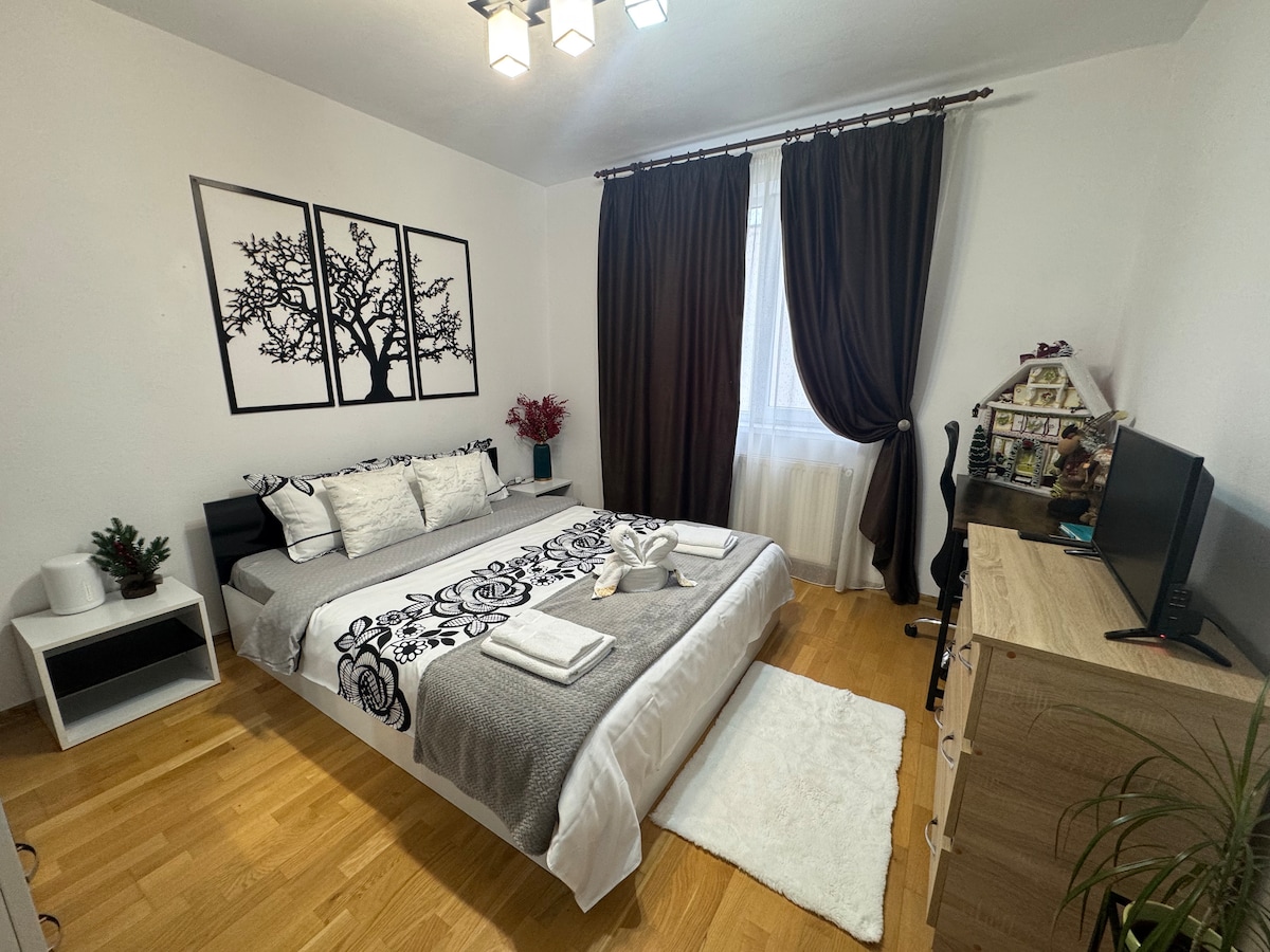 L-appartament tal-ewwel sular għandu 2 ikmamar tas-sodda separati, salott b' sufan, kamra tal-banju, gallarija, arja kkundizzjonata, termostat, parkeġġ privat, lift. Jekk ikun hemm bżonn, nistgħu nżidu mejda li tista' tintlewa u li tista' tirranġa l-għoli bħala spazju fejn tista' taħdem fil-kamra tas-sodda. 6 km 'il bogħod miċ-ċentru tal-belt. Mgħammra b' kollox u mgħammra bl-għamara u l-appliances tal-ogħla kwalità. Sptar Iperbariku f' 500m, Lavender Land f' 29 km, Sovata, Sighisoara jew Turda Salt Mine f' inqas minn siegħa 'l bogħod.