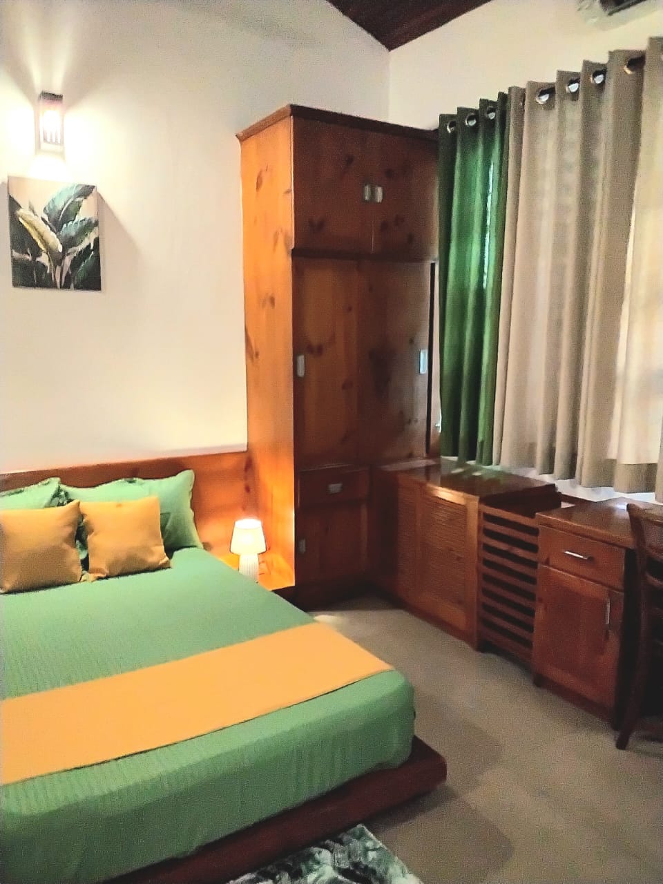 Spacious, airconditioned room with attached washroom located on the upper floor of our home. The unit is reached via a single flight of broad stairs. Has two beds (with the option of a 3rd), wall cupboards, a wardrobe, sink, a large table which doubles up as a workspace/dining table and cooking facilities. The bookcase contains fact & fiction and publications by the hosts on Sri Lanka, with comfortable chairs to relax in and read. Photographs and paintings by Sri Lankan artists adorn the walls.