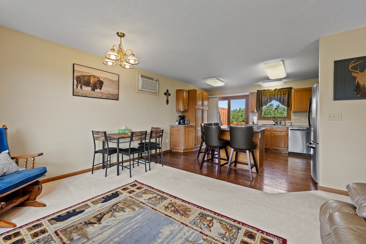 Din id-dar bi 3 kmamar tas-sodda u kamra tal-banju waħda tinsab f 'viċinat residenzjali kwiet f' Rapid City. 10 minuti sewqan 'il bogħod miċ-ċentru. 25 minuta sewqan' il bogħod minn Mt. Rushmore. Żewġ kmamar tas-sodda b 'sodod ta' daqs Queen u sodda waħda ta 'daqs King fil-kamra tas-sodda l-oħra. Sufan fil-kamra tas-salott jista 'wkoll ikun qed jorqod fuqu. Dishwasher, magna tal-ħasil u dryer disponibbli għall-użu. Wi-Fi bla ħlas, Netflix. ***(JIEN KEMXEJN FLESSIBBLI BIL-PREZZ FL-ASLA TA 'OFFSEASON, ĦOSSOK LIBERU LI ĠĠORRLI OFFERTA)***