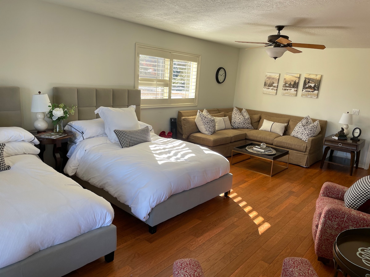 Cheryl u Curtis jixtiequ li tingħaqad magħhom f 'Sage Hill, santwarju ta' lodge tal-muntanji rinnovanti li jinsab fil-muntanji ta 'Park City Wasatch. Żguri li se jogħġbuk minħabba l-veduti, il-post, il-kwiet u l-privatezza. Is-suite privata tiegħek tinkludi kamra tas-sodda b' sodda doppja queen u spazju wiesa' għall-gwardarobba, kamra tal-banju sħiħa u salott kbir b' saqaf bil-kamin, TV 64”, sufan tal-ġilda u rilassatur - kollha fuq art separata. Dħul maqsum mal-hosts. Għażla oħra ta' rqad għall-klijenti hija sufan sodda queen komda (+$ 30.)