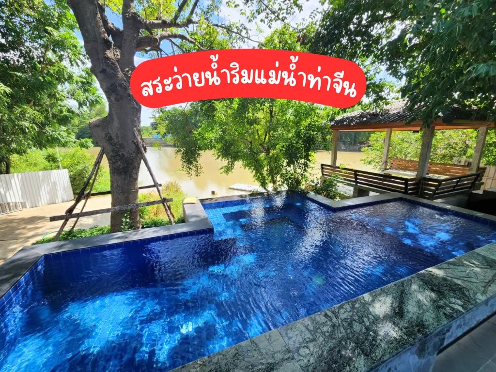 พูลวิลล่าขนาดใหญ่ 4 ห้องนอน 5 ห้องน้ำ ติดริมแม่น้ำท่าจีน บ้านเป็นส่วนตัว มีสระว่ายน้ำ