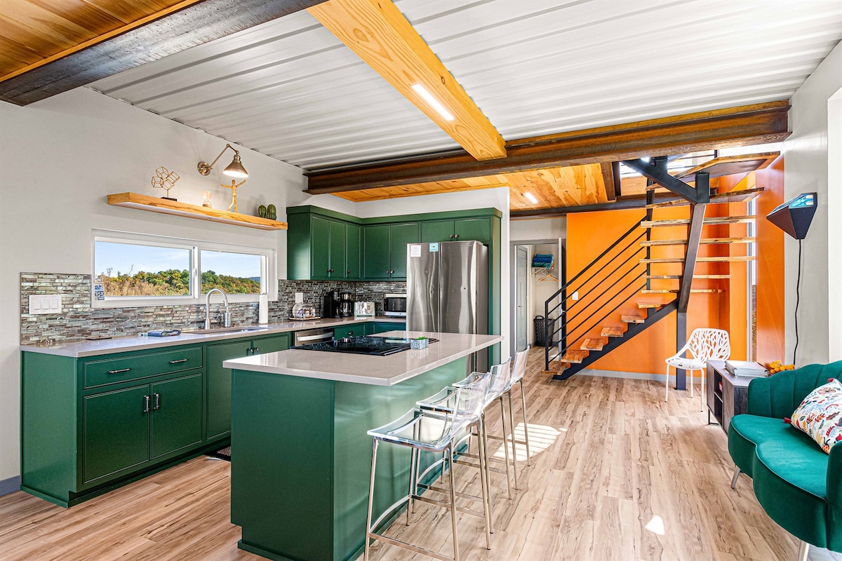 Ħu ħsieb dil-vaganza unika u kwieta. Din il-kabina b 'kamra tas-sodda waħda li tħares lejn creek tinsab ftit minuti' l bogħod mir-ristoranti u d-divertiment iżda maqtugħin biżżejjed għall-privatezza u l-paċi. Għandu kċina sħiħa, 50 pulzier tv, WiFi, bar tal-kafè, gverta u ħafna iktar! Issa għandek l-għażla bħala żewġt ikmamar tas-sodda jekk teħtieġ iktar spazju agħti titwila lejn il-listing l-ieħor tagħna bil-kabina oriġinali tal-injam ħdejn il-creekside! Ibbukkja ż-żjara tiegħek illum!