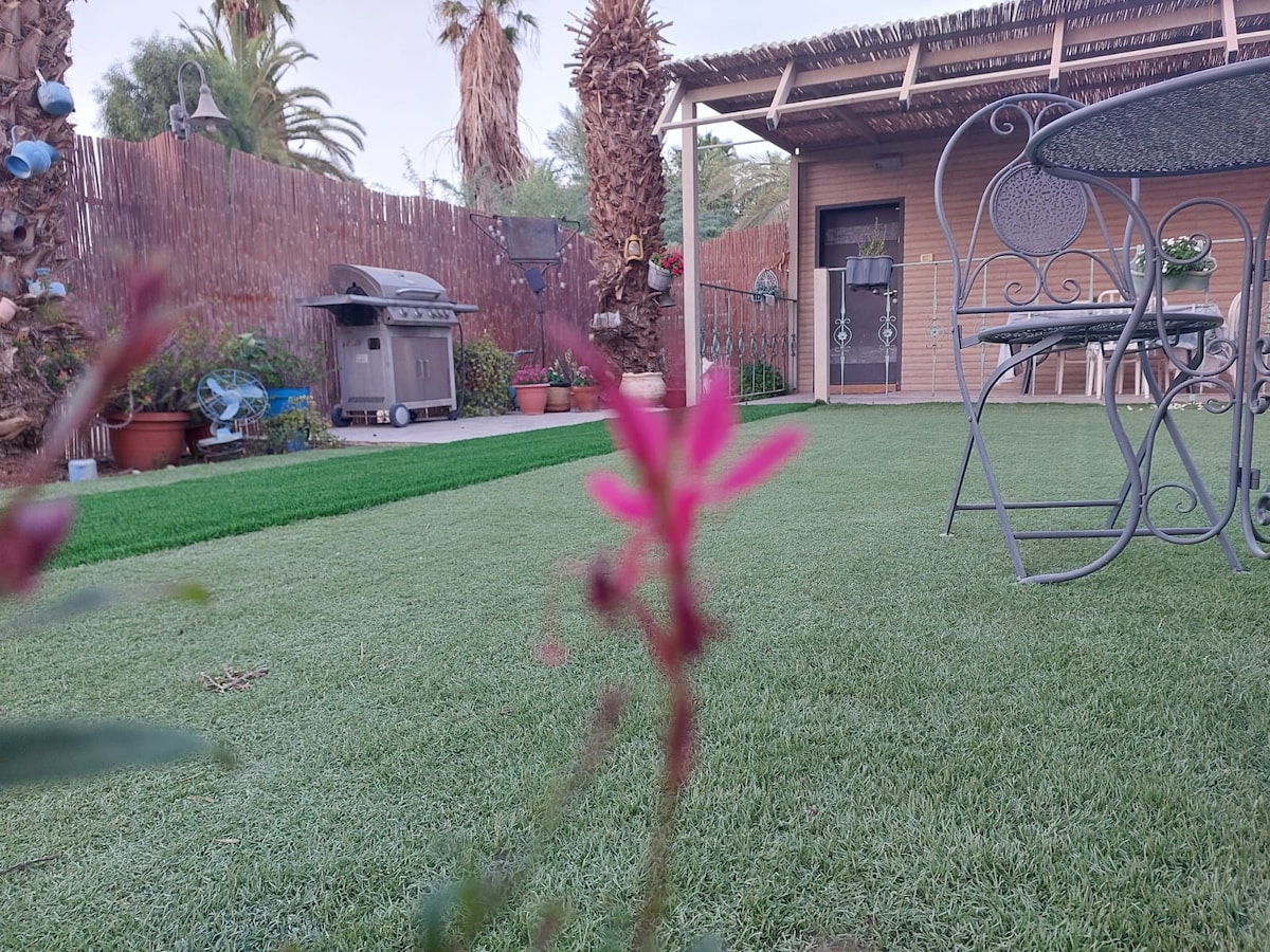 צימר מדברי יפייפה ושליו, המשקיף למטע תמרים גווני המדבר, עצי התמר, השקט והיופי ממלאים בהשראה ליצירה ומנוחה הצימר עשוי חלל אחד מואר ונעים, מאפשר שהייה מותאמת לכתיבה , אומנות, מוזיקה ולימוד נפלא לחופשה זוגית או למשפחה קטנה שמחפשת ליהנות מאירוח כפרי, בריכה מושבית מעולה, שבילים טבולים בעצי ענק ירוקים, גן שעשועים ומדבר יפייפה בצימר ישנו שולחן כתיבה רחב, כיסא נח לישיבה ממושכת, שולחן אוכל, מטבח מאובזר, מכונת קפה, ספה ומיטה מפנקת המדבר נפרש במלוא הדרו במרחק הליכה וניתן להינות ממטעמים מקומיים