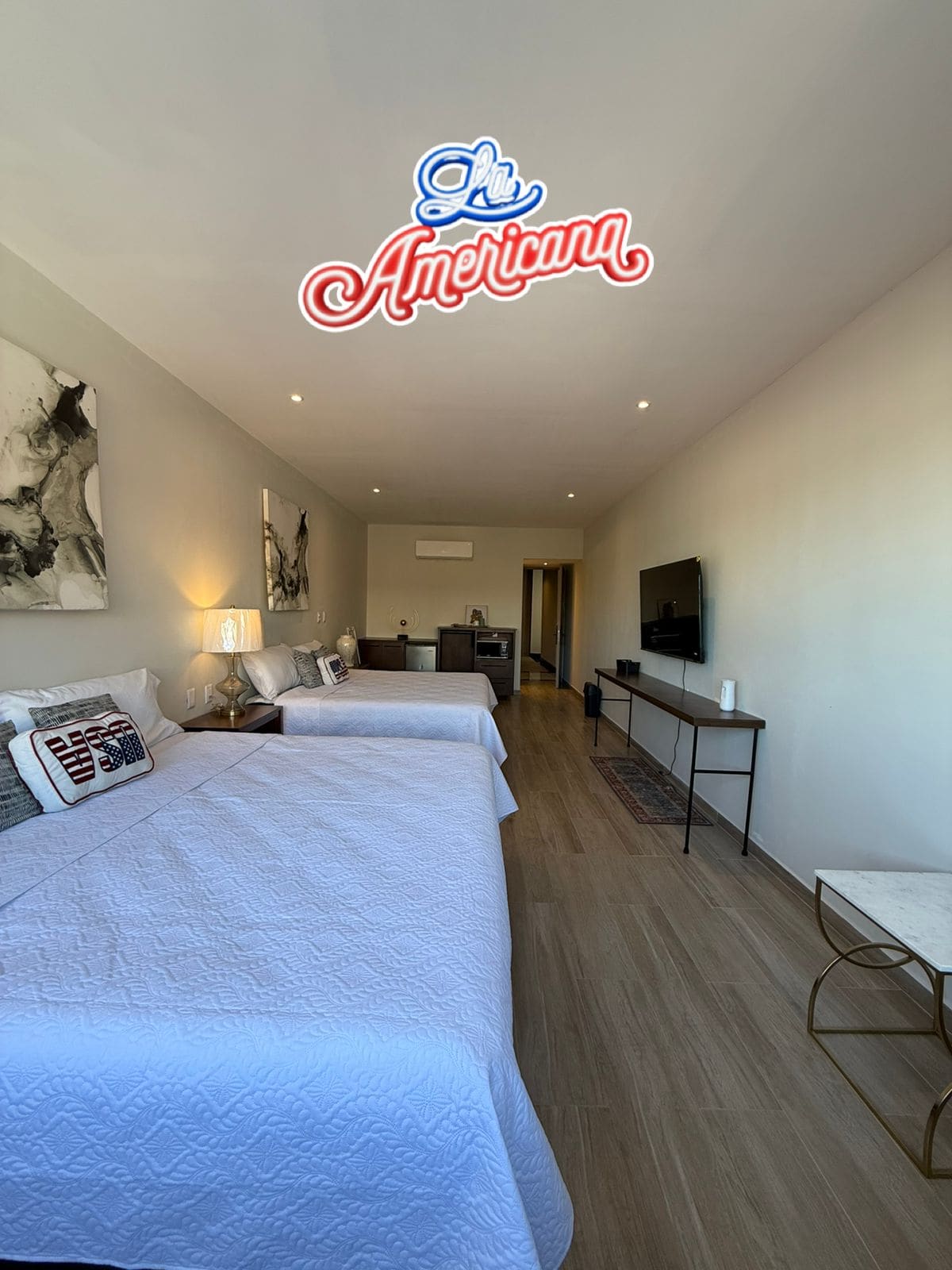 Jr Suite Familiar, cómoda, amplia, segura y Tranquila. Excelente opción para descanso Familiar de 4-5 personas adultas ya que cuenta con 2 camas Extra Grandes, Disfruta de un ambiente para relajarte en una de las zonas de Mayor comercio de la Huasteca. Con una ubicación que permite el acceso a los mayores atractivos turísticos de la ciudad a pie. Disfruta La Americana