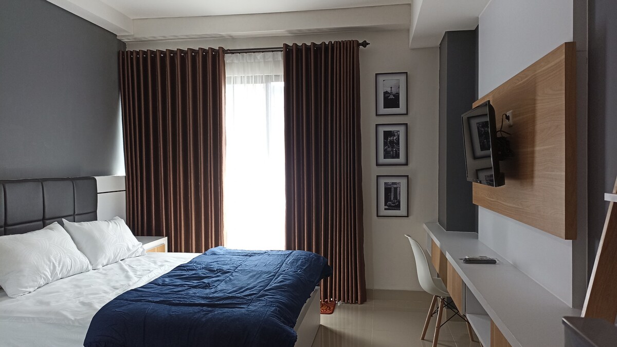 Studio room with modern minimalist design located at strategic area. Room with 1 queen size bed, modern bathroom, kitchen and balcony with view. Fast self check-in and check-out. Free parking, pool, gym, lobby area with cafe, restaurant, laundry, mini market. Facilities: - 55 Inc smart TV - Wifi - AC - hot shower - refrigerator - microwave - kettle - kitchen sink - blender - rice cooker - basic cooking equipment - toiletries Notes : No breakfast