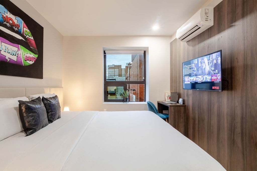Din il-kamra eleganti tal-lukanda tħallat l-istil u l-kumdità, li fiha sodda doppja king bi bjankerija tal-ogħla livell. Tinsab f' waħda mill-iktar viċinati vibranti ta' Montreal, tinsab passi 'l bogħod minn kafetteriji, bars u ġojjelli kulturali. Il-klijenti jgawdu wkoll minn aċċess għal salott tal-lobby li jilqgħek u kantina spazjuża b' postijiet komdi fejn toqgħod bilqiegħda, mejda tal-pixxina u TV fuq skrin kbir-perfett għax-xogħol jew għar-rilassament.