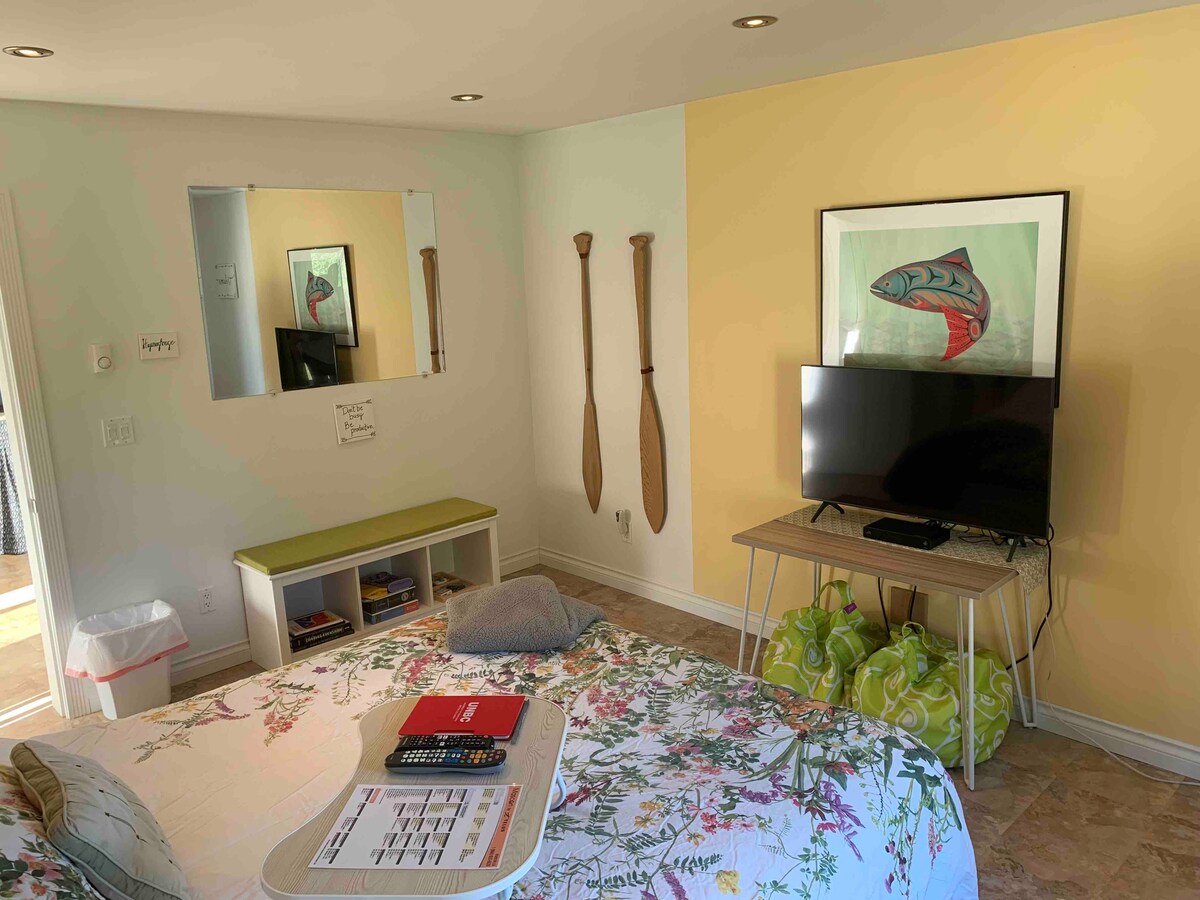 L-għan tagħna huwa li noffru esperjenza ta 'suite ta' lukanda nadifa u kwieta fid-dar tal-klijenti tagħna fil-proprjetà tagħna. Il-veduta tal-ġenb tat-triq tagħna hija tucked bogħod fiż-żona ta 'żvilupp l-aktar ġdida ta' Skidegate. Il-vaganza nadifa tagħna tagħtik vaganza komda mill-avventuri tiegħek f 'Haida Gwaii. Ħsibna għal kull dettall u tinkludi doċċa li toqgħod bilwieqfa fuqha u kċina parzjali b 'kumditajiet uniċi bħal xibka biex tiżżerżaq il-granċijiet, waders tal-cushions u platt tal-ħelu ta' merħba! Qrib ħanut tal-ikel u pompa tal-gass.