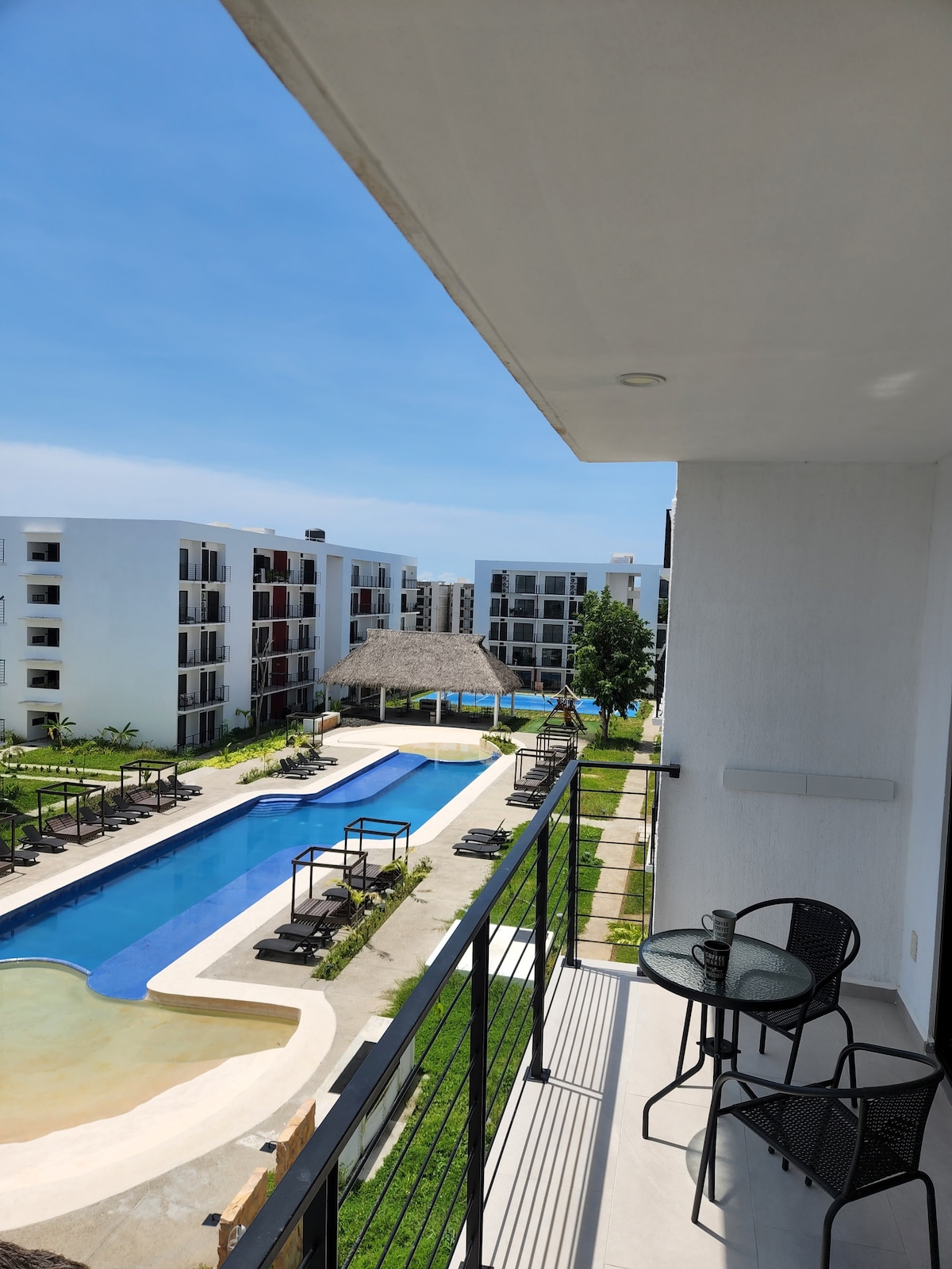 Appartament Luxury ġdid, eżatt fuq il-bajja f' Nuevo Vallarta. immakulat,. Gawdi waħda mill-aqwa bajjiet , sunsets sbieħ, Ristorant, 2 Albercas infinita, pixxina oħra fir-ramel. Żewġ recamaras, 3 sodod: 1 king 2 queen. A/A, 3 TVs wieħed 70", microwave, hair dryer, magna tal-kafè, eċċ. żewġ terrazzin. Għamara moderna. lożor u quilts tal-qoton. (Il-magna tal-ħasil u t-tnixxif tal-ħwejjeġ huma bla ħlas, għal kiri ta' 6 iljieli jew aktar biss). Parkeġġ għal karozza waħda.