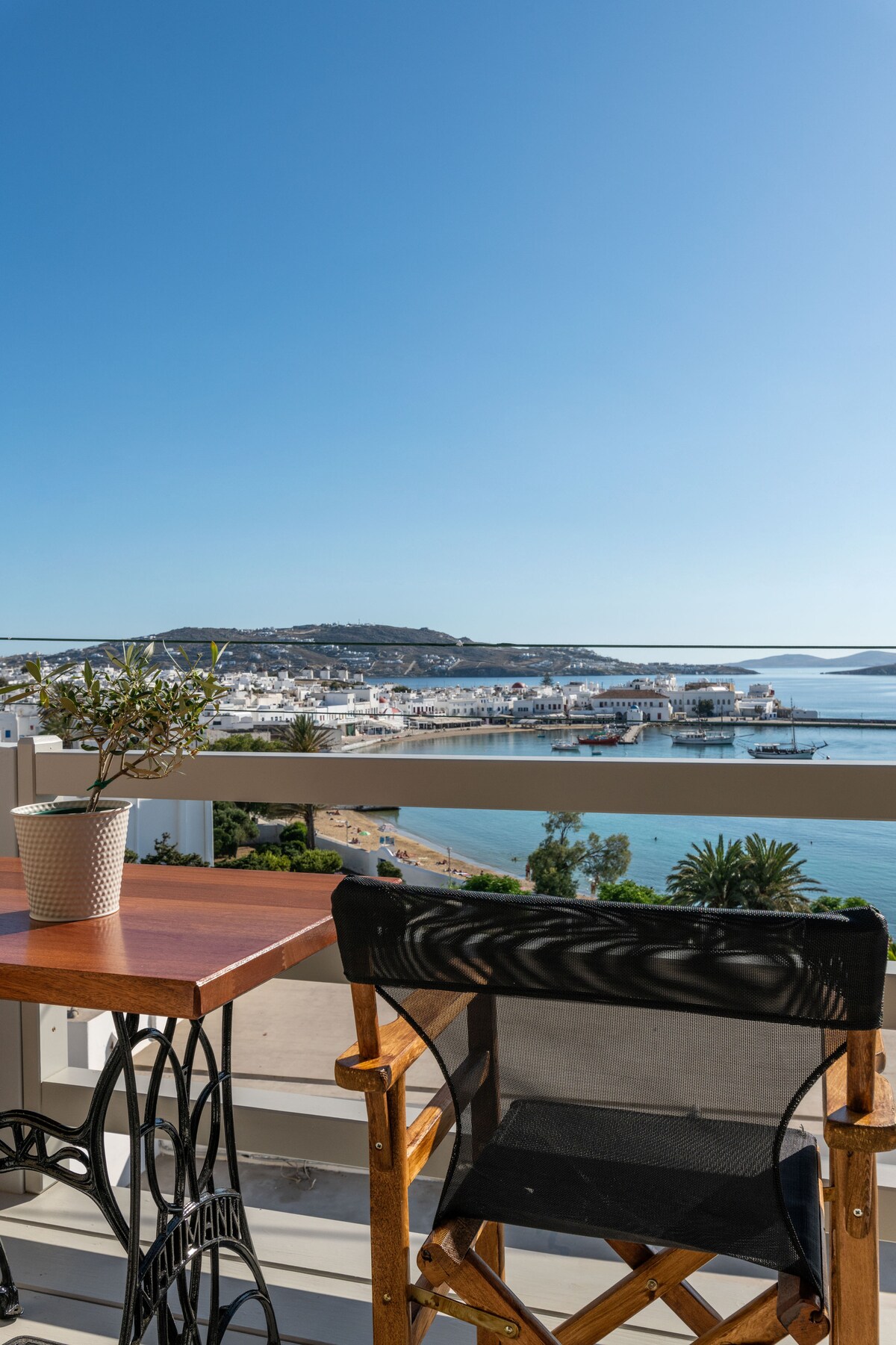 Rinnovata fl-2023 u li tinsab fuq għolja żgħira, fuq il-pjazza ta 'quddiem il-baħar tal-belt, toffri l-lussu li tkun inqas minn minuta mixi' l bogħod miċ-ċentru ta' Mykonos, iżda tgawdi l-benefiċċji tal-privatezza, ta' pixxina maqsuma mal-oħrajn u ta 'parkeġġ privat. It-tindif tad-dar huwa kull 3 ijiem u kull jumejn matul Lulju u Awwissu. Il-kompost huwa ddisinjat mill-iktar perit famuż u rikonoxxut internazzjonalment fil-Greċja. Żona = 75m2.