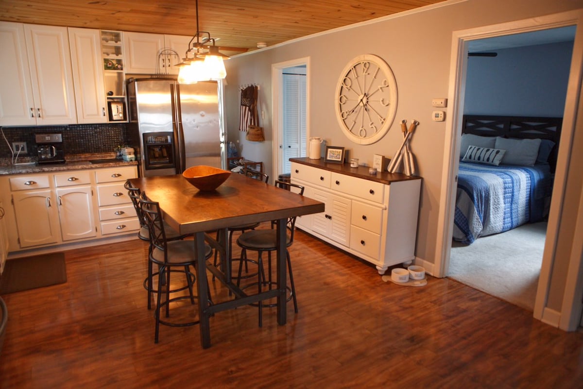 Dar kompletament rinnovata maqluba biex tidher qisha stazzjon tal-gass vintage fuq barra. L-ewwel sular għandu salott/kċina miftuħa, b 'mixja tal-injam antik funzjonali f' cooler, 1/2 banju, bar u bieb tal-garaxx li jiftaħ għall-gverta. Ħafna materjali reklamati użati fil-kostruzzjoni inklużi briks, bibien għall-bar, eċċ. Is-sular ta 'fuq kien immudellat wara boutique hotel b' sodda king, banju sħiħ u tieqa bl-istampi li tħares lejn għadira stokkjata u trakk tan-nar vintage. Il-porzjon tal-garaxx mhux inkluż, iżda jista 'jkun disponibbli.