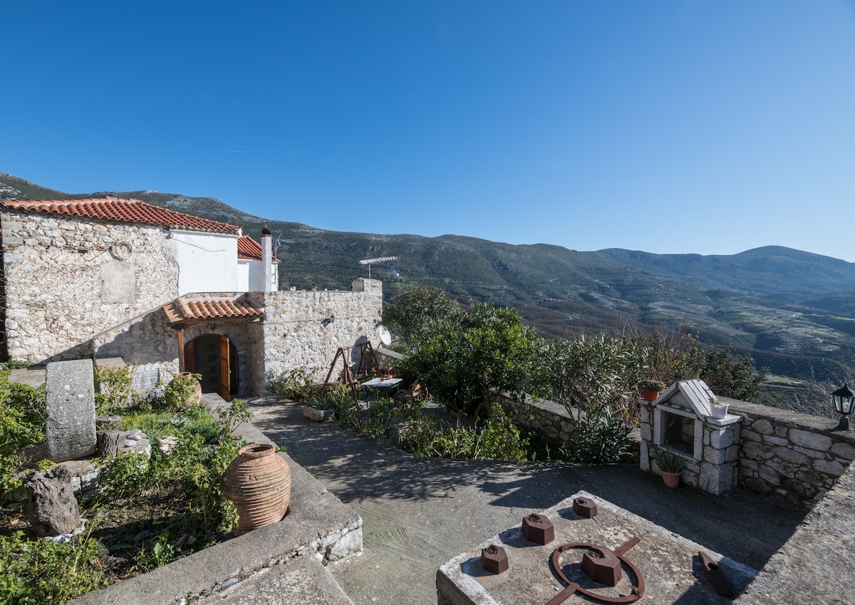 Dar tal-ġebel b 'veduta tal-baħar f' Kardamyli.