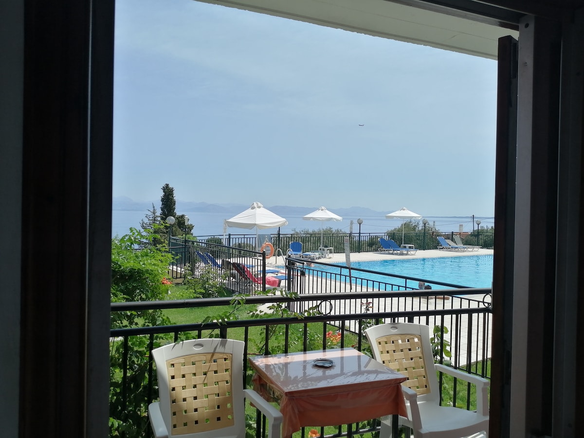 Jinsab 10 mili 'l bogħod mill-belt/ajruport ta' Corfutown u 40 m 'il bogħod mill-bajja, huwa kumpless ta' bini b 'appartamenti mgħammra b' kollox. Mibni b 'mod amfiteatrali, joffri veduta panoramika tal-baħar. L-appartamenti huma mgħammra b' arja kkundizzjonata b 'xejn, TV, Wi-Fi, kamra tal-banju privata, oġġetti tal-kċina u friġġ. Dawn kollha jinkludu gallarija mgħammra, minn fejn tista 'tgawdi l-veduti sal-baħar jew sal-ġnien aħdar mill-isbaħ. Hemm ukoll parkeġġ b 'xejn għal karozza privata u l-waqfa tal-karozza tal-linja tinsab eżatt quddiem il-bini.