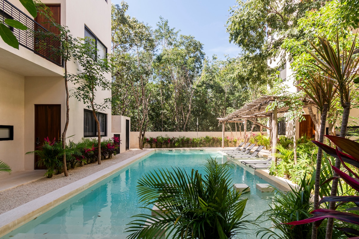 Appartament loft mill-isbaħ b'aċċess dirett għall-pixxini, qrib iċ-ċentru ta' Tulum u ftit minuti biss 'il bogħod mill-bajja mill-isbaħ u l-klabbs ta' fuq il-bajja ta' Tulum. Gawdi minn diversi pixxini mill-isbaħ, pixxina fuq il-bejt, sodod tax-xemx, gym sabiħ, persunal 24 siegħa kuljum, A/C b' saħħitha, lift, Wifi veloċi (400 Mbps), purtieri blackout, smart TV 55", kċina mgħammra b' kollox u parkeġġ privat. Ikla jew ixrob xi ħaġa fil-beraħ b'veduti panoramiċi mill-isbaħ mir-ristorant fuq il-bejt