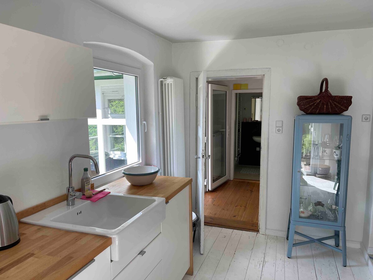 Mhuwiex kbir, iżda għandu l-kumditajiet kollha li għandhom ikunu mingħajr fancy. Il-cottage hija ħelwa u qadima, mhux dar ċkejkna disinjatriċi. Iċ-ċentru ta 'Berlin u Potsdam jintlaħqu malajr. Aċċess privat, gallarija b 'veduta tal-ilma, terrazzin u ġnien madwaru. Salott bi kċina, banju, kamra tas-sodda u spazju tal-irqad żejjed fuq is-sufan sodda bi ħlas żejjed. Aħna ngħixu ħdejn il-bieb, għalhekk qatt m' għandna aċċess jew problema ewlenija. Qegħdin fil-Mogħdija tal-Ħajt. Il-pets huma wkoll milqugħa.