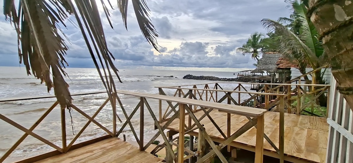 Beachfront cabana at Luna Beach Home & Cabanas in Boossa, Galle, with private balcony and stunning sea view. Relax in a comfortable double bed, fan, and fresh linens. Shared bathroom is clean and stocked. Steps from the beach with chairs, sunbeds, and ocean breeze. Perfect for couples, solo travelers, or small families seeking a peaceful, back-to-nature escape.