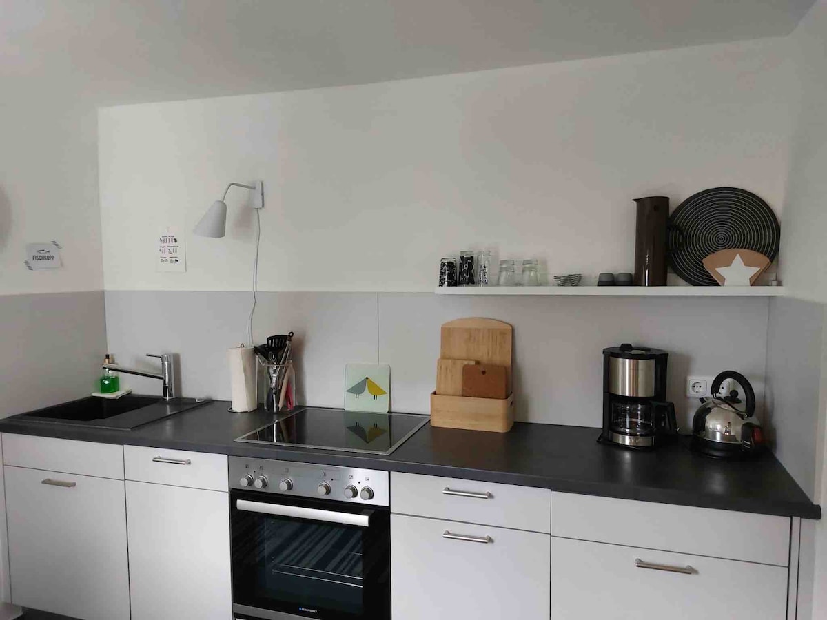 Sabiħa, spazjuża 4 kmamar f 'post paċifiku ħafna. Kamra tas-sodda waħda b 'sodda doppja (200 x 200 cm), Kamra waħda b 'sodda kbira (140 x 200cm) u sodda għall-klijenti (90 x 190 cm) 1 WoZi b' sufan, mejda tal-ikel, TV, kamra ta' quddiem u kamra tal-banju tad-doċċa. Saqqu ieħor li jingħalaq tal-art disponibbli fuq talba. Microwave, friġġ, kuker tal-misħun, platti eċċ., iżda l-ebda forn tiegħek stess - jekk ikun meħtieġ, il-kċina (sular wieħed ogħla) ma tista 'tintuża wara ftehim qasir. REWE b 'furnar f' distanza bil-mixi.