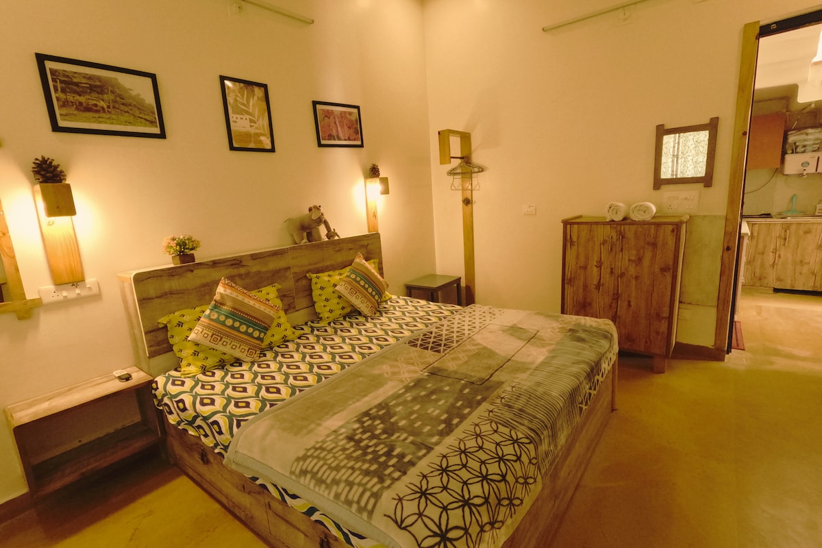 Reachable only by a 3.5 km / 1 hr hike (or gypsy ride on request) and perched in a tropical corner of Talyanigaad between Dehradun and Mussoorie, facing a stunning private waterfall, Kipling Trail Cottage is a wilderness retreat to help rediscover the joy in the uncomplicated moments of existence. The spacious and elegant two-bedroom cottage boasts an inviting dining area and bedrooms exuding warmth, adorned with handpicked traditional rugs, boasting breathtaking views of the lush landscape.