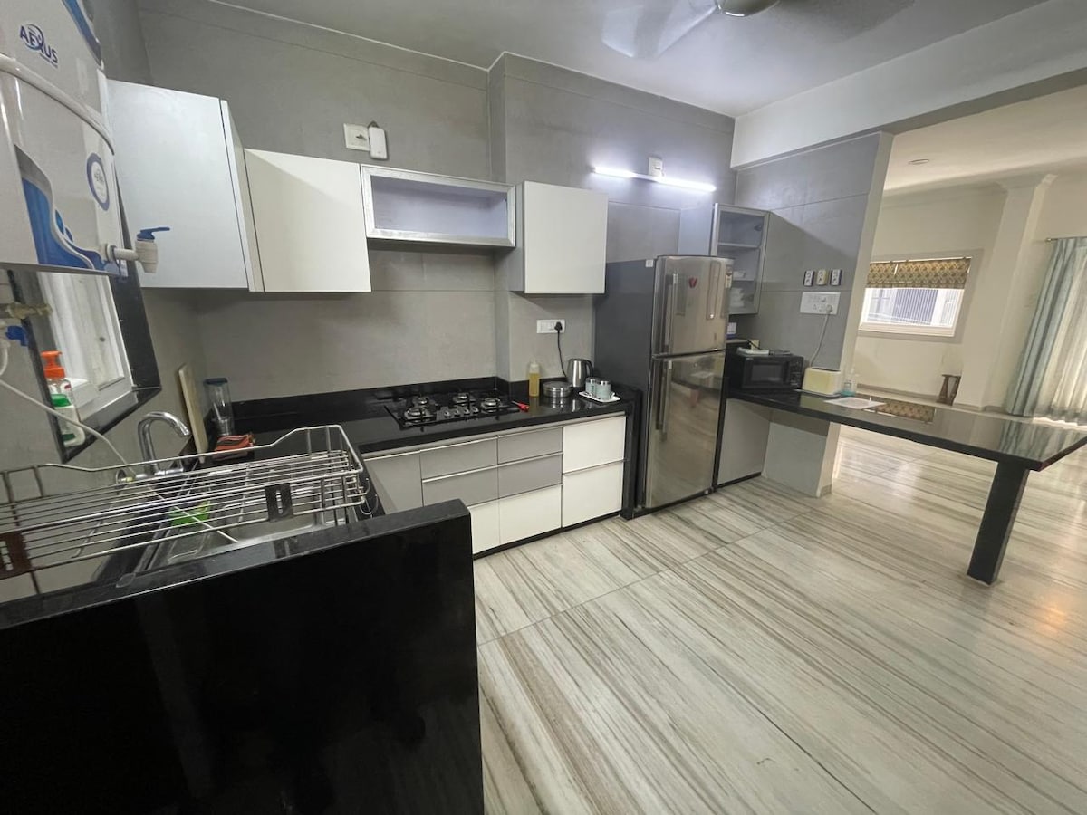 Aħna nilqgħu biss il-Familji. Appartament mgħammar b' kollox f' komunità magħluqa, b' żewġ ikmamar tas-sodda, kamra tal-familja kbira b' terrazzin miftuħ, żona tal-ikel u kċina mgħammra b' kollox. Żewġ kmamar tal-banju sħaħ, waħda mwaħħla u waħda komuni, it-tnejn b 'ilma sħun u kiesaħ. Iż-żewġ kmamar tas-sodda kif ukoll is-salott huma mgħammra b 'AC. Kċina mgħammra bi friġġ, RO għall-ilma tax-xorb, microwave, cooktop ta 'induzzjoni, utensili, pożati, crockery eċċ. u magna tal-ħasil fiż-żona tal-ħasil. 43" TV fiż-żona tas-salott.