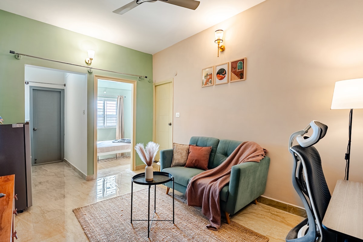 Cottage Ewropew– 1BHK komdu b'Gallarija, WiFi u Ambjent għal Ikla ta' Filgħaxija bid-Dawl tax-Xemgħa! Id-dar tagħna tinsab qrib Vaishnavi Tech Park, Wipro u RGA Tech Park u hija ideali għax-xogħol u d-divertiment. Gawdi l-aqwa birreriji bħal Byg Brewski, Bier Library u Sarjapur Social fil-qrib. Beige & Breeze toffri gallarija komda, ġewwieni eleganti u atmosfera sabiħa għal post fejn tistrieħ mill-ħajja tal-belt.