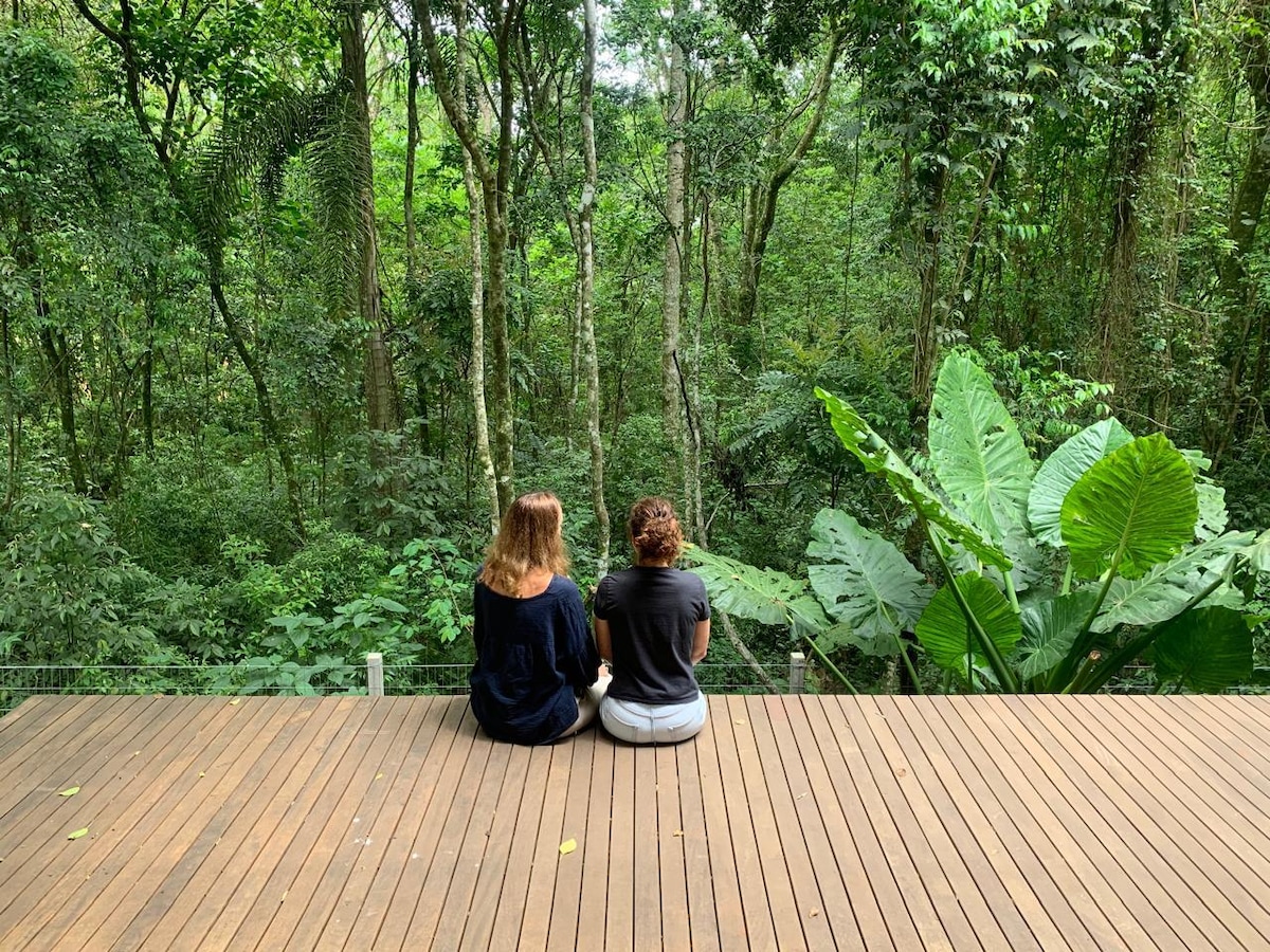 Casa em meio a um agradável bosque, com 1 quarto amplo e todos os ambientes climatizados. Oferece TV, Wi-Fi, Netflix etc. Cozinha com fogão, micro-ondas, torradeira, churrasqueira, fogão à lenha e geladeira; área de serviço com máquina de lavar roupas. Acesso independente da casa principal, em 5000 metros de área verde, lago, quadra de basquete etc. Colecionamos frutas, são 60 tipos que você poderá apreciar de acordo com a estação do ano. Comporta 6 pessoas em camas e até 8 em colchões extras.