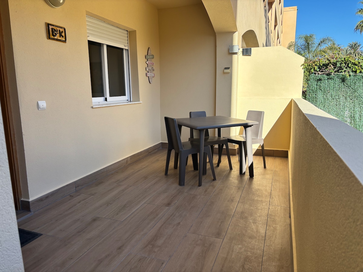 Appartament baxx faċċata tal-bajja fil-porch ta 'Puerto Rey faċċata tal-bajja, Almeria. Żewġ kmamar tas-sodda, kamra tal-ikel, kċina bil-bar, kamra tal-ħasil u kamra tal-ħażna. Arja kkundizzjonata, sufan sodda, wifi, 55"smart TV (Netflix u Amaon Prime) washer u dryer. Il-kċina hija mgħammra b 'microwave, magna tal-ħasil tal-platti, magna tal-ħasil tal-platti u oġġetti tal-kċina kompluti. Il-kamra tas-sodda ewlenija tikkonsisti f 'sodda doppja ta' 160 u s-sodda sekondarja b' żewġ 90 sodda, it-tnejn b' armarji. Biċċa art tal-parkeġġ privata fuq barra. Pixxina tal-Komunità.
