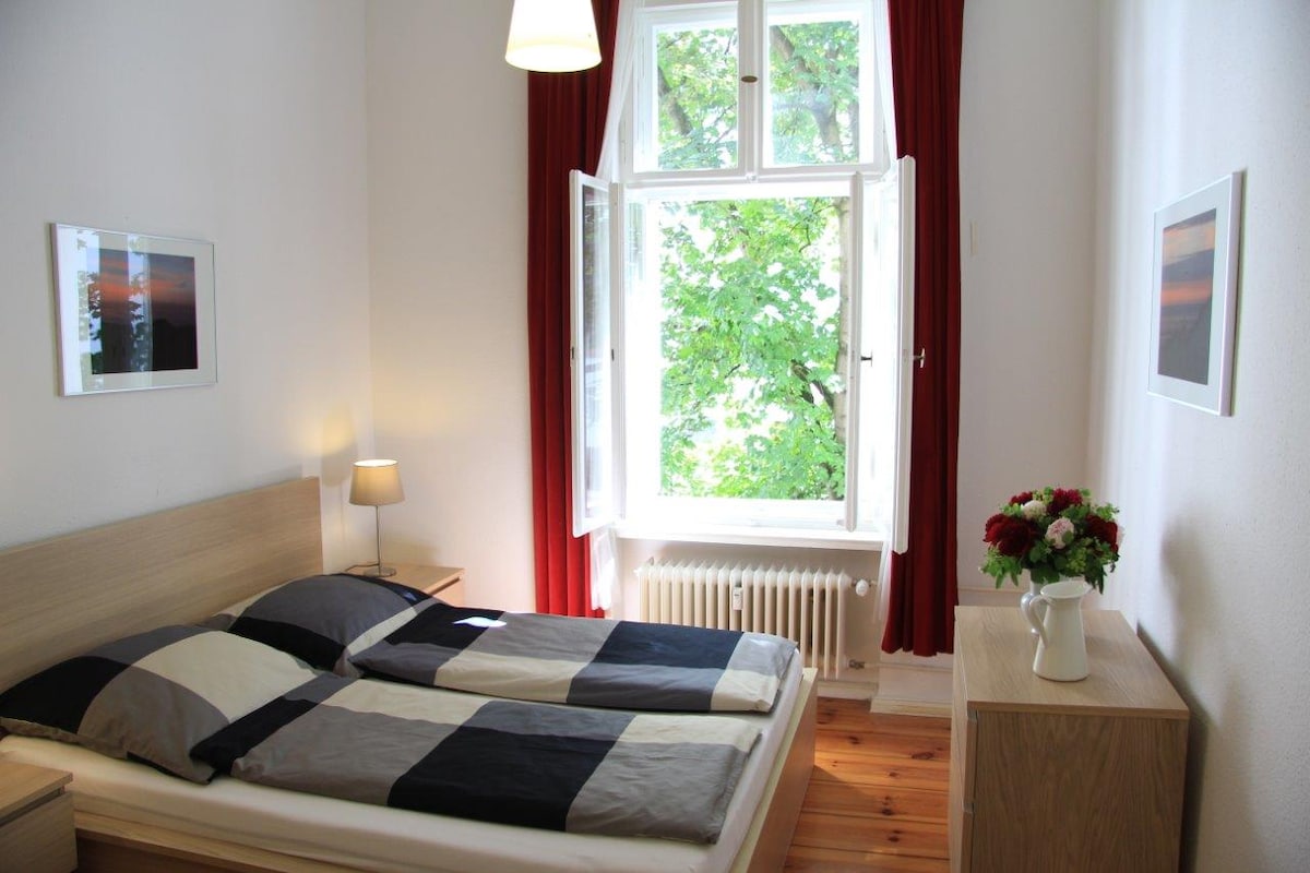 Studio żgħir ħelu (42 m2) b' veduta fil-park enormi (Tiergarten). Ideali għal żjara qasira ta' 2 persuni. 3 km mixi 'l bogħod mill-Bieb ta' Brandenburg. VANTAĠĠI: postijiet għall-parkeġġ bla ħlas (!) + post f' nofs park naturali + kalm u kwiet + inkl. bjankerija tas-sodda u xugamani + hairdryer + WiFi + faċilitajiet tat-tisjir + stazzjon fuq l-art quddiem id-dar + checkin billejl possibbli + sodda tat-trabi + lift CONTRAS: bini qadim -> iżolament ħażin tal-ħoss - ftit sodda doppja/mimlija (140x200) - għalja