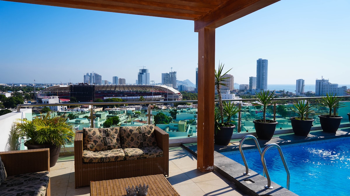 Esperjenza Mazatlan mill-għoli f' dan l-appartament esklussiv. Gawdi minn finituri lussużi, 2 ikmamar tas-sodda b' sodod u TV qishom queen, salott spazjuż b' gallarija faċċata tal-oċean u kċina mgħammra b' kollox. Għandha wkoll pixxina mill-isbaħ fuq il-bejt. Tinsab quddiem Malecon u ftit passi 'l bogħod miż-Żona tad-Deheb, se jkollok aċċess immedjat għal bajjiet, ristoranti u nightlife. Ideali għal dawk li qed ifittxu kumdità, veduti inkredibbli u post uniku.