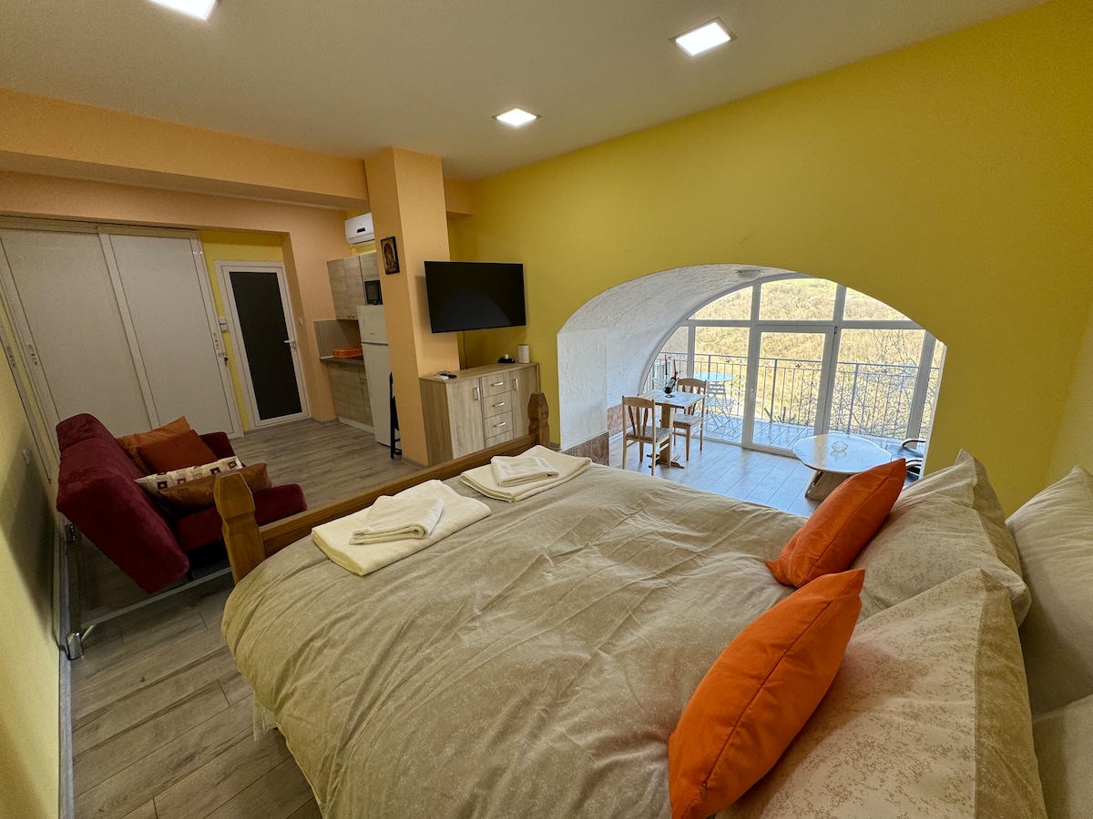 Bil-veduta inkredibbli ta 'wieħed mis-simboli ta' Veliko Tarnovo - il- ,,il-Monument ta ’Assenevtsi’ ', u ħafna mill-belt, Tarnovo Studios se jġiegħlek tħossok l-ispirtu uniku tal-belt kapitali antika Bulgara. Aħna noffrulek studio kbir u mgħammar b 'mod modern b' żona tal-kċina, sodda doppja komda, sufan sodda, kamra tal-banju privata u gallarija . L-istudio jista 'jakkomoda sa 4 persuni. Għandna studio ieħor iżgħar bl-istess veduta u post: https://bg.airbnb.com/rooms/42879235