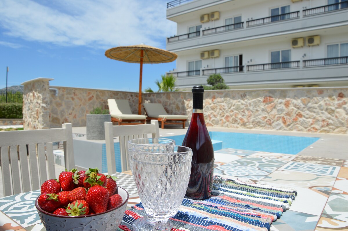 Esperjenza ħarba lussuża ġewwa Aquarama Blue, li tinsab fil-belt tal-kosta sabiħa ta 'Ixia, Rodi. Hekk kif tidħol fl-appartament b 'żewġt ikmamar tas-sodda, se tintlaqa' b' veduti panoramiċi mill-isbaħ tal-baħar u nżul ix-xemx. L-intern huwa daqstant impressjonanti, b 'dekorazzjoni moderna u eleganti matul il-proċess kollu. Il-kċina mgħammra b 'kollox, kompluta b' magna tal-ħasil tal-platti, tistiednek issajjar ikla mill-isbaħ u tiekol b' affresk fuq il-gallarija privata. Jew, għaddi l-pixxina maqsuma mal-oħrajn u xarrab ix-xemx Mediterranja.