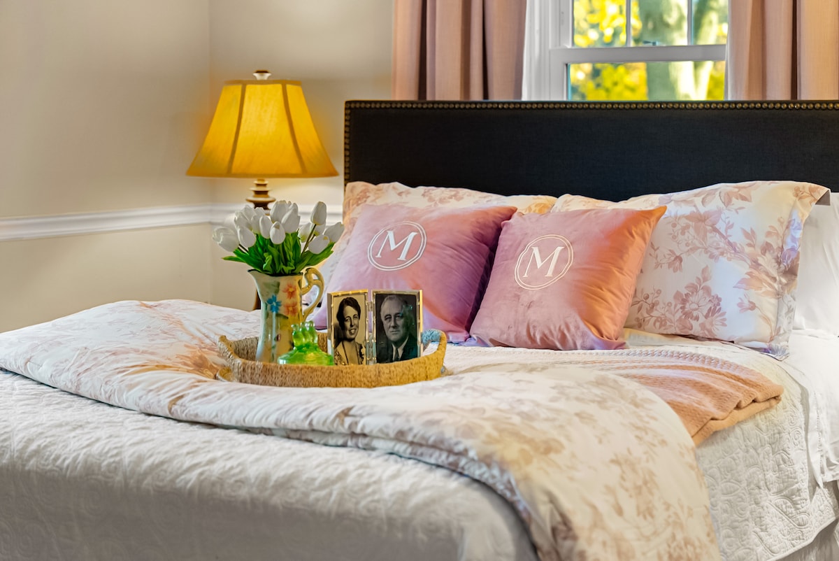 A graceful retreat inspired by history and heart. Eleanor Roosevelt once graced the walls of this home on a visit to North Manchester. About the suite: Romantic & dignified The Lady Eleanor Suite pays tribute to its namesake's timeless grace. Soft blush tones, elegant furnishings, and curated art pieces create an atmosphere of refined comfort. The suite features a private ensuite, romantic bedding and a restful sitting area - ideal for morning coffee, evening reading, or simple reflection.