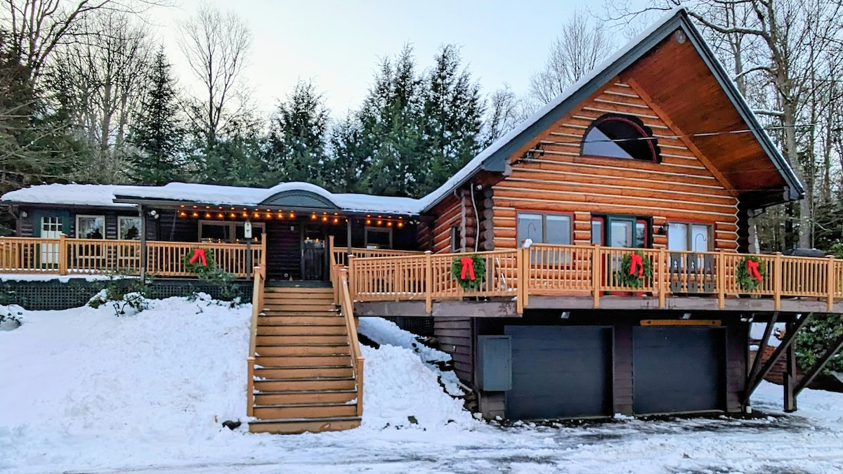 Handcrafted log home in the Mad River Valley, a short walk to Blueberry Lake and minutes to Sugarbush, Mad River Glen, wedding venues, hiking, and biking. Ideal for ski trips, wedding guests, and quiet retreats year-round. • 2 kitchens • 2 living rooms • 3 queen bedrooms • Short loft w/ 2 twin air mattresses (low ceiling) • 2 sofa beds • Whirlpool bathtub • Electric fireplace • Wrap-around deck • Porch swing • Fire pit • Grill • Thoughtfully landscaped outdoor spaces to relax & unwind