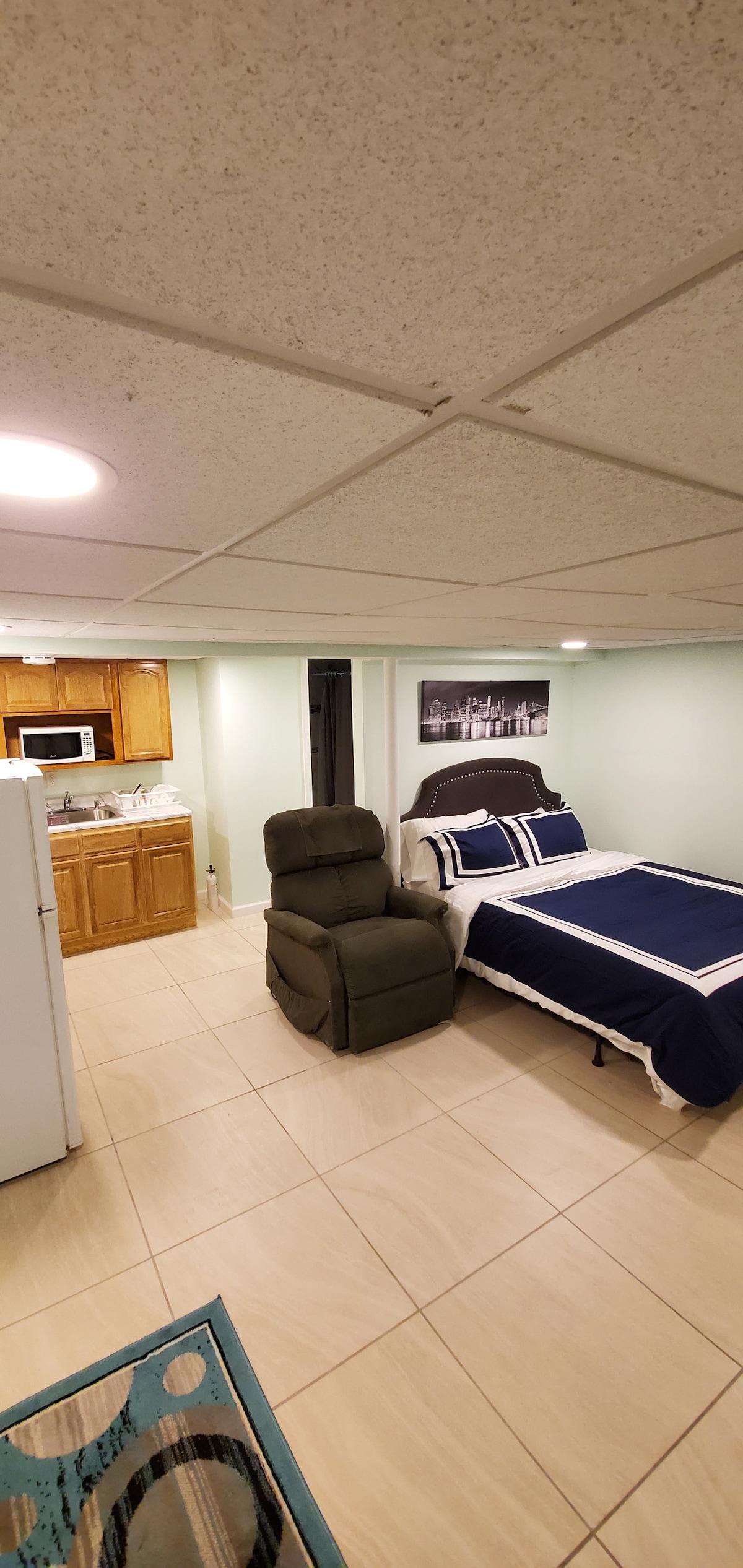 Private studio in Franklin square . WIFI, microwave, toaster, coffeemaker. kitchenette area, refrigerator, private bath, 1 queens bed (High quality comfortable mattress). (walk down about 10 stairs to basement children /dog on first floor - it is a family home. Place to yourself no sharing spaces. we let dog out in our around yard and you might see him.