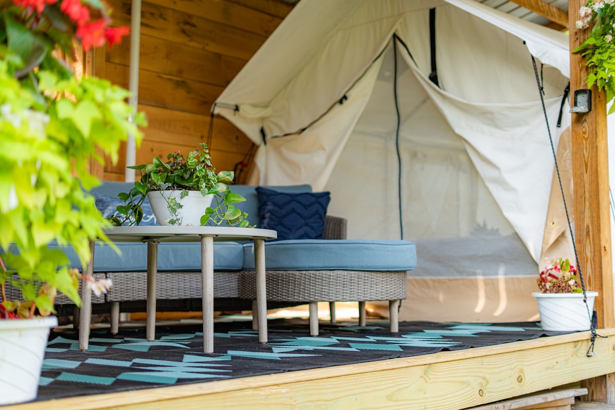 Kampeġġ b' xi ħaġa ta' kumdità kreattiva = Glamping. Din hija tinda safari bil-kanvas b' cooker tal-injam u sodda komda għal tnejn. Qiegħed fuq l-għadira tas-sajd ta' 3 ettari tagħna b' aċċess faċli għad-dar tal-banju, għad-daħla tal-mogħdijiet għall-mixjiet fit-tul u għall-ħanut tal-kampeġġ tagħna. Il-bjankerija hija pprovduta. Mhux 100% prova ta' bug jew kriterju, għalhekk jekk jogħġbok tħallix ikel jew żibel barra. Il-kumditajiet jinkludu d-dwal li jaħdmu bid-dawl tax-xemx u l-istazzjon tal-iċċarġjar. Ejja oqgħod fuq l-għolja u ara li l-ħut jaqbeż.