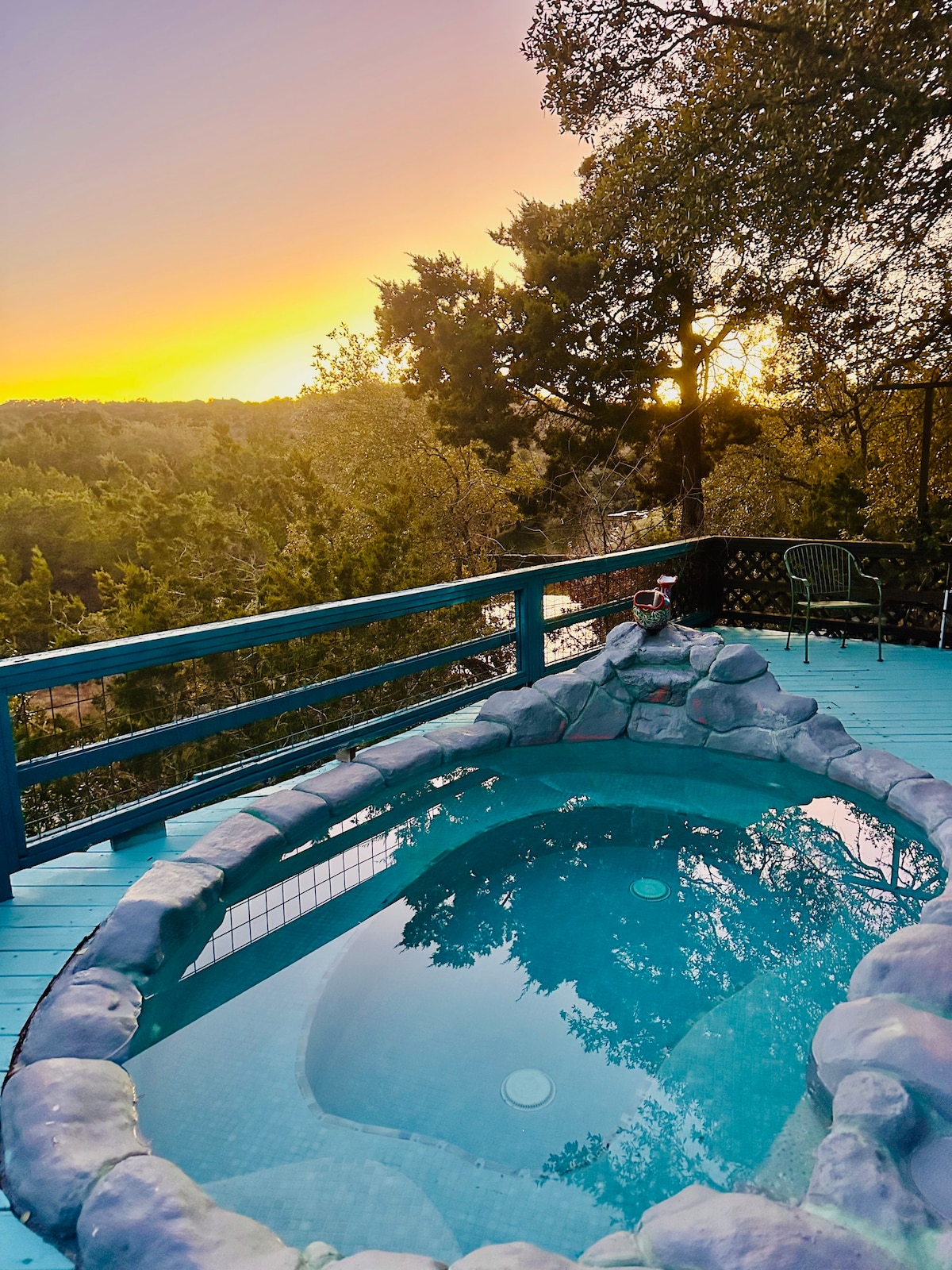 Vaganza perfetta! Gawdi l-pixxina PRIVATA u l-hot tub tiegħek fil-kabina unika tagħna fuq l-għoljiet b' 8.6 ettari. Sunsets mill-isbaħ mill-gverta ta 'fuq. Float fil-pixxina fuq il-bloff li tħares lejn ix-Xmara Blanco (normalment xmara niexfa) jew irrilassa fil-hot tub. Gawdi nar komdu, poġġi bilqiegħda fil-gażebo jew ħu l-passi tal-ġebel 'l isfel sal-bank tax-xmara għal mixja fit-tul. Mur fi Pjazza Wimberley għall-ikla ta 'filgħaxija u għax-xiri. Ebda PETS. Iva fuq IL-WIFI, post tajjeb fejn tista' taqla' l-plakka. INST-A-GRAM @sunsetcabinwimberley