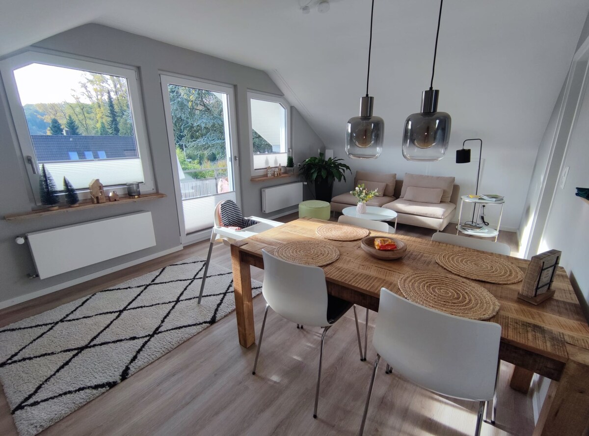 L-appartament tal-attiku tagħna mgħammar b 'mod imħabba - jekk jogħġbok innota li xi taraġ għandhom jiġu mmaniġġjati - għandu dak kollu li għandek bżonn għal żjara iqsar jew itwal u se jintuża minnek waħdek. Kwiet fl-aħħar ta 'triq residenzjali, qrib iċ-ċentru + S-Bahn. Il-loft punteġġi b 'gallarija mgħottija fil-Lbiċ, arja kkundizzjonata, Wi-Fi bla ħlas, armarju walk-in, washer-dryer, iż-żona tas-sawna tista' tintuża fuq talba, karozza elettrika tal-iċċarġjar. Meta jkun meħtieġ, kamra doppja oħra ħdejn il-bieb.