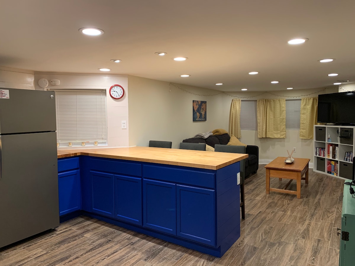 Comfort and convenience abound in this stylish suburban suite! Mid-century and vintage motif meets modern touches and style. Guests have the entire basement, with a private bedroom, bathroom, huge living space, and a private entrance in a quiet house on a beautiful treelined street. Backyard access, coffee, easy street parking. Walking distance to parks and public transportation, a short drive to downtown Evanston and the lakefront, easy access to Chicago, Northwestern. Loyola, Skokie.