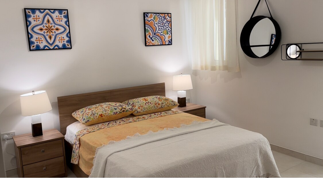 Appartament spazjuż ħafna u modern b' żewġt ikmamar tas-sodda b' veduti tal-baħar wesgħin tul il-Bajja ta' Xemxjia. Veranda ta' quddiem b' mejda u siġġijiet tal-ikel, bitħa ta' wara kompletament mgħammra b' għamara tal-ġnien. Iftaħ il-kċina, il-kamra tal-ikel u ż-żona tas-salott. 2 ikmamar tas-sodda doppji kbar b' sodod king-size u ħafna spazju għall-ħażna. 2 kmamar tal-banju u kamra tal-utilitajiet moderni ħafna b' xkafef tal-magna tal-ħasil u d-dryer. Wifi bla ħlas AC Kemm fil-kmamar tas-sodda kbar kif ukoll fil-Kċina/salott.