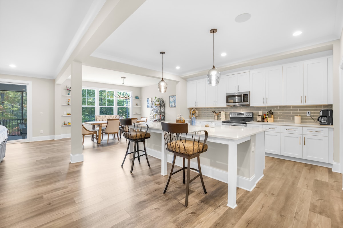 Relax with the whole family at this peaceful lakehouse retreat, nestled on a quiet cove of Lake Wylie. Enjoy your days out on the lake on the provided Kayaks or paddle boards, and then huddle around the fire with your loved ones in the evening. With two indoor wood-burning fireplaces, a fire table on the deck overlooking the lake, and a fire pit in the backyard, you'll have plenty of options. Grill up some steaks on the outdoor brick BBQ and then relax on the porch swing or comfy egg chairs.