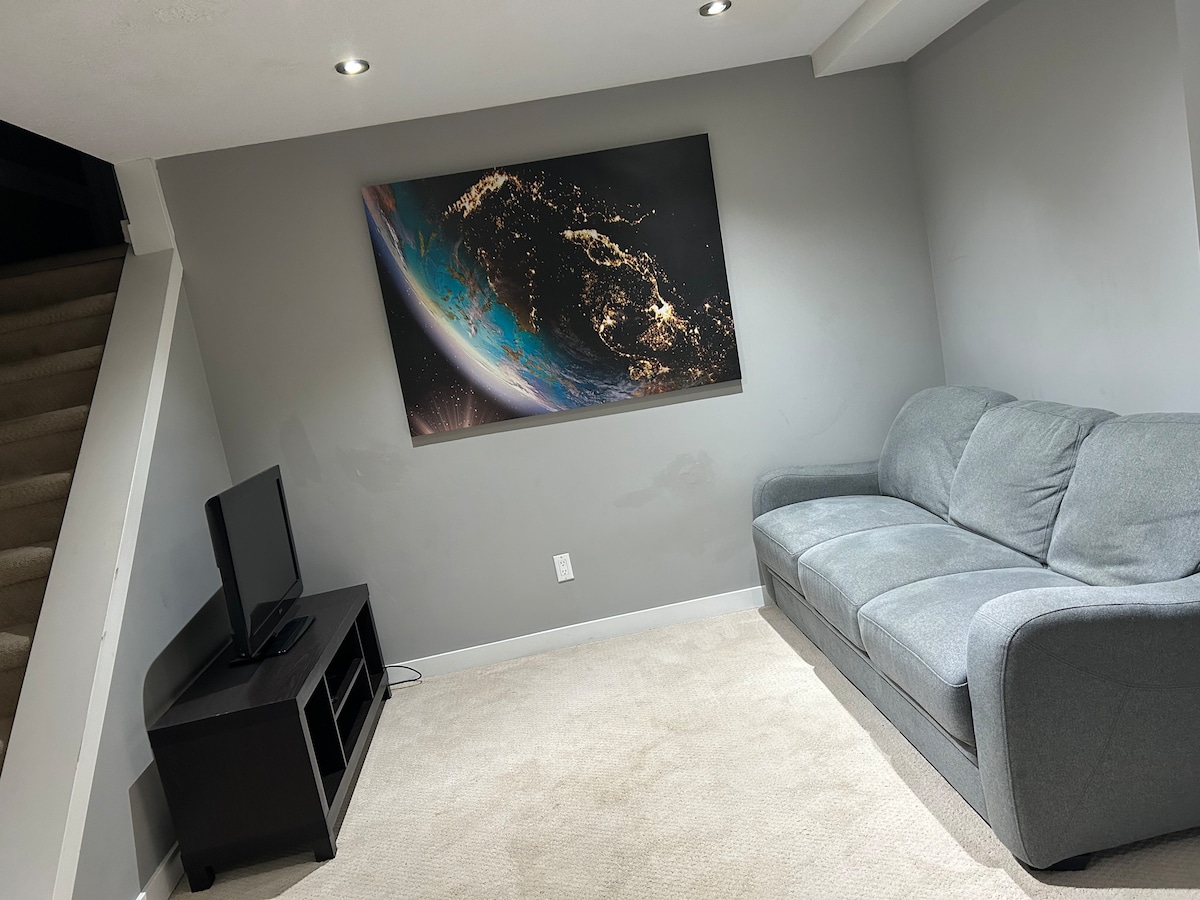 Irrilassa u Irrilassa f' Suite Moderna Spazjuża!! Post perfett fejn tirrilassa u tgawdi mid-dar f' din is-suite ta' kantina privata spazjuża u serja li tinsab f' viċinat paċifiku u kalm. 15-il minuta sewqan sal-ajruport u 5 minuti sewqan sa ħwienet tal-merċa bħal Superstore, Costco u Walmart. Mixja ta' 2 minuti biss sal-park u mixja ta' 3 minuti sal-eqreb waqfa tax-xarabank, Spazju ta' Għajxien Komdu filwaqt li tara l-ispettakli favoriti tiegħek fuq Netflix. NUMRU TAR-REĠISTRAZZJONI STA24-00265