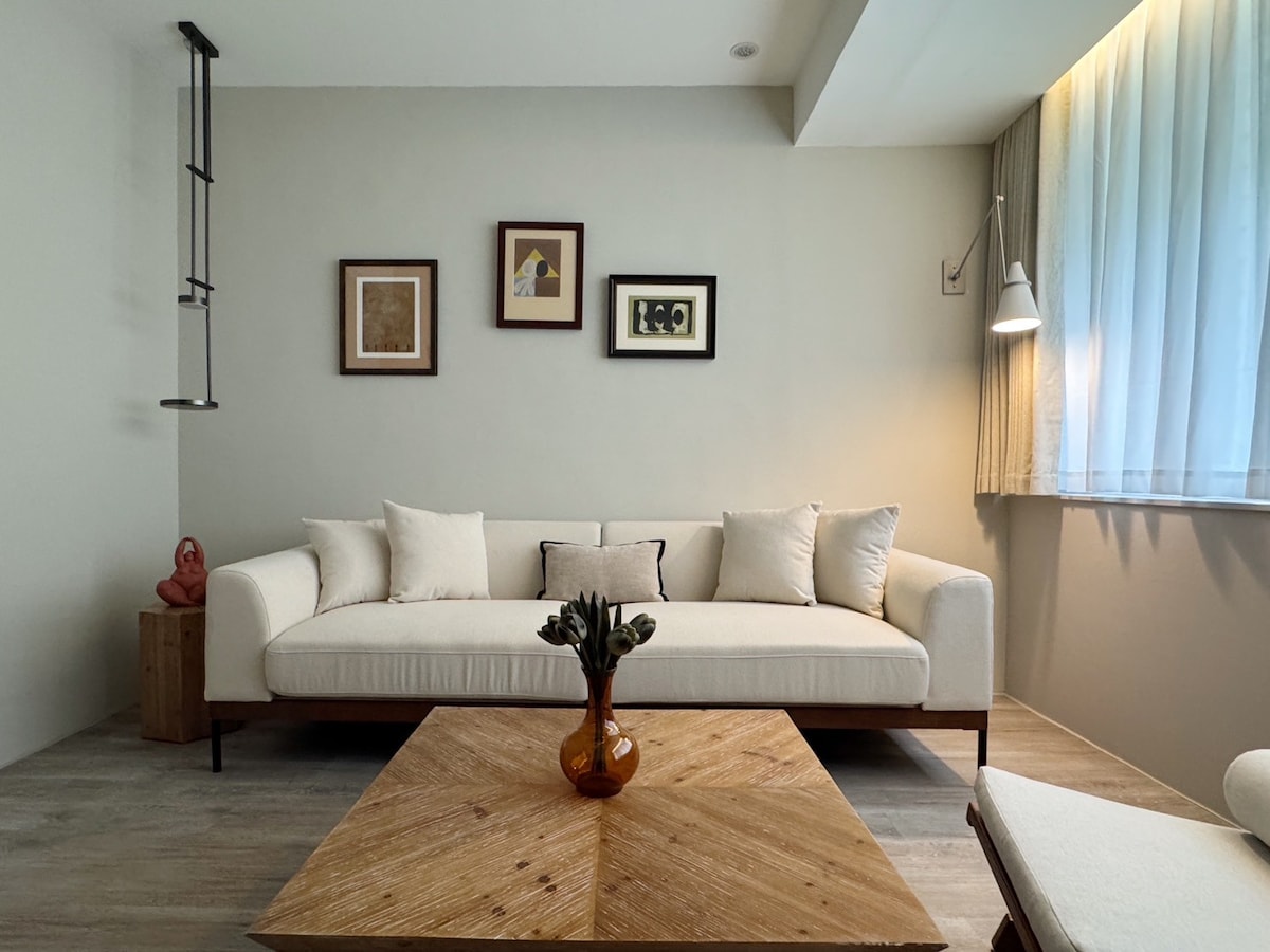 室內的灰白主色,配搭北美木紋銅色傢俱及家飾, 用心為您的居住空間提供沈靜優雅的感覺。日韓系電器的選用,不論是無線充電藍牙喇叭,大螢幕伸縮高清電視,都能滿足您對影音效果的要求。房源位於高樓內縮樓層,阻絕不必要的噪音並滿足您對景觀,安靜及隱私的要求。大樓並配有全天候警衛,住戶專屬電梯,公用大露台,以及地下收費停車場, 位處西門町核心路段,無論搭乘捷運或自駕都非常方便。Earth tone- based interior design offers warming, calm, healing and delighted atmosphere. Room facilities, including double bed, en- suite bathroom with shower enclosure, air conditioning, smart 4K TV with movies/Netflix, WIFI internet, cove lighting and music player with wireless connection & USB charger ports.